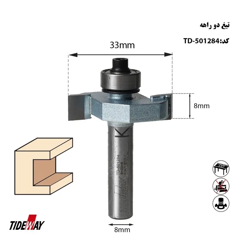 وجود بلبرینگ در پایین تیغ دوراهه بلبرینگی شفت 8 کارگیر 8 عرض 33 یکی از بزرگترین مزیتهای فنی آن محسوب میشود. بلبرینگ به عنوان یک راهنما عمل میکند و با حرکت روی لبهی سالم چوب یا امدیاف، باعث میشود تا عمق برش در تمام طول مسیر یکسان باقی بماند. این ویژگی نیاز به استفاده از گونیا یا فنس روی دستگاه اورفرز را در بسیاری از مواقع از بین میبرد.